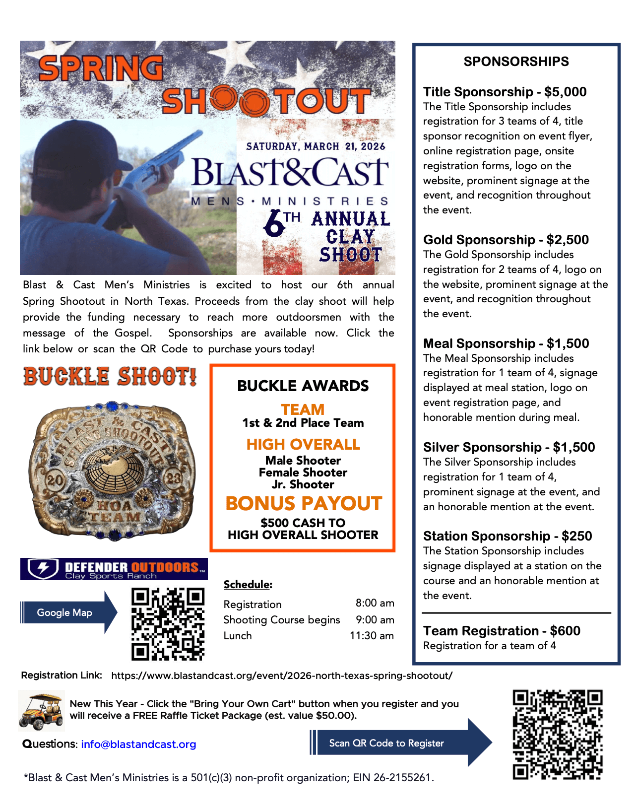 [vc_row][vc_column icons_position=”left”][vc_column_text css=””]Blast & Cast Men’s Ministries is excited to host our 6th annual North Texas Spring Shootout at Defender Outdoors in Fort Worth, TX. Sponsorships and team registration are now open. Space is limited, so register early.