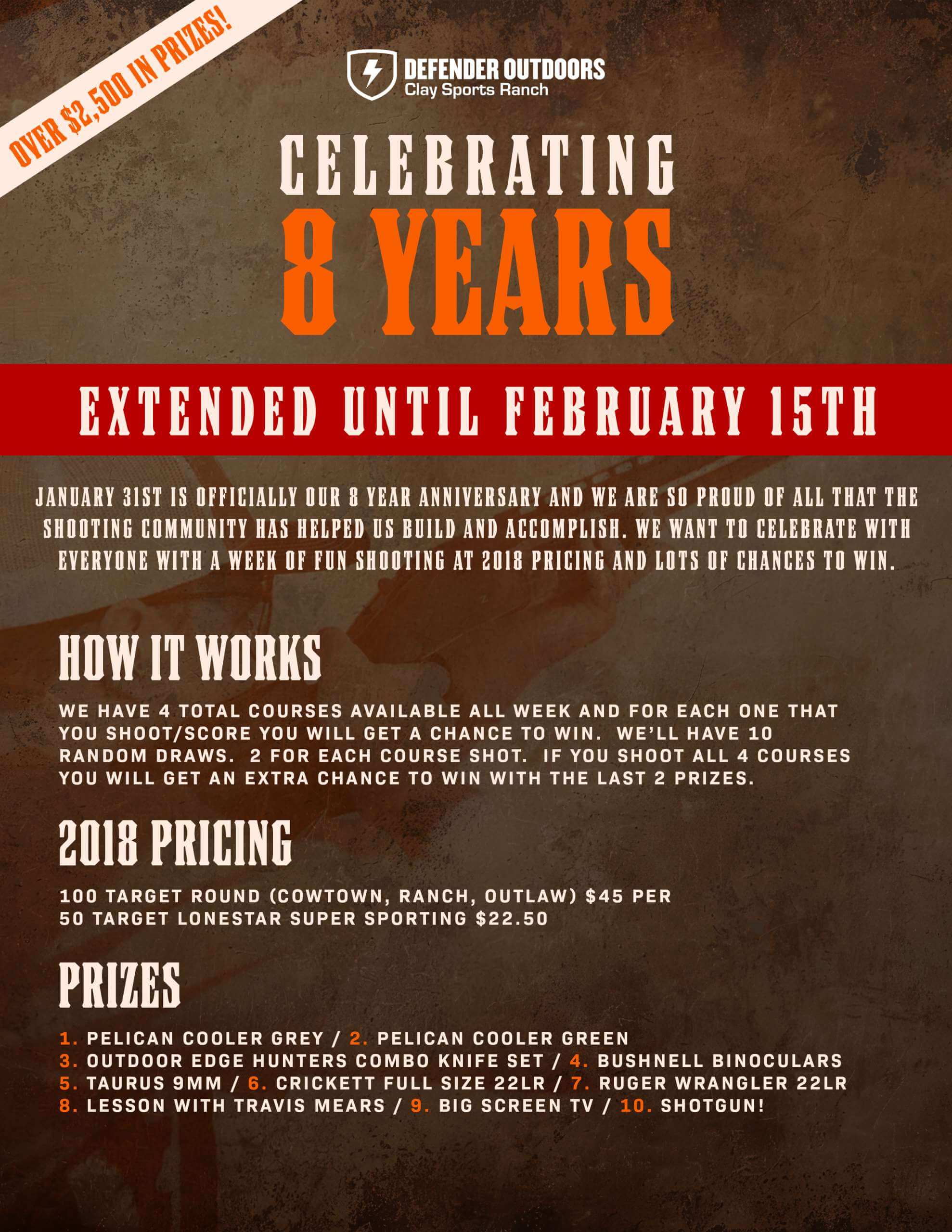 January 31st is officially our 8 year Anniversary and we are so proud of all that the shooting community has helped us build and accomplish. We want to celebrate with everyone with a week of fun shooting at 2018 pricing and lots of chances to win! Over $2500 in prizes!