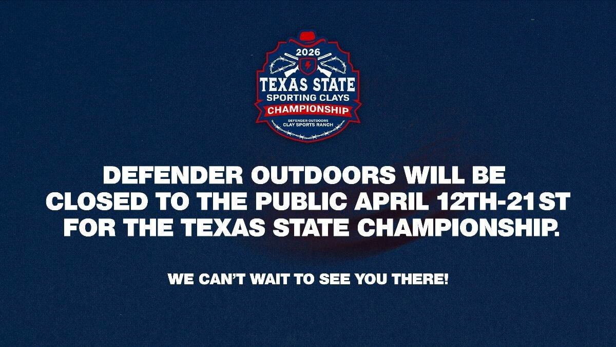 Defender Outdoors Clay Sports Ranch will be closed to the public from April 12th to April 21st for the 2026 Texas State Sporting Clays Championship. We appreciate your patience!
