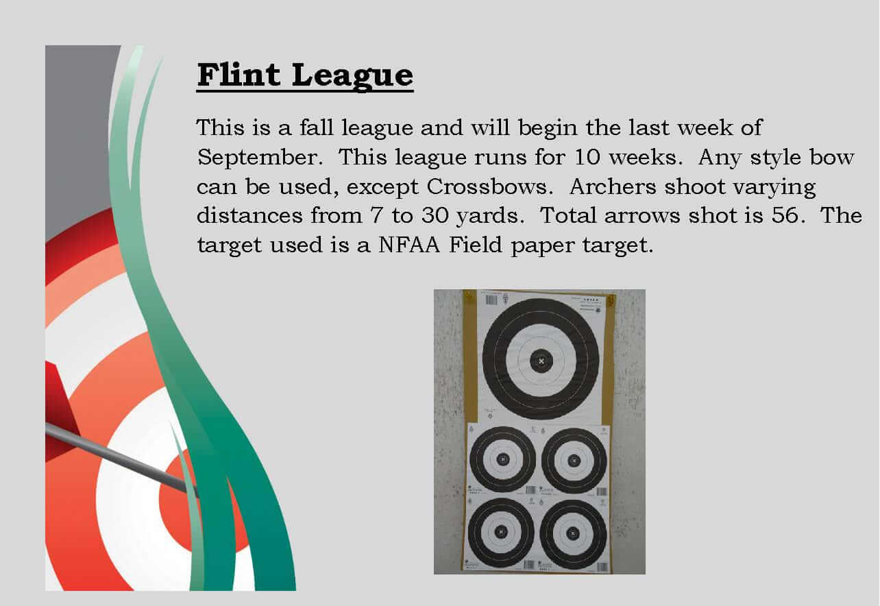 This is a fall league and will begin the last week of September. This league runs for 10 weeks. Any style bow can be used, except Crossbows. Archers shoot varying distances from 7 to 30 yards. Total arrows shot is 56. The target used is a NFAA Field paper target.