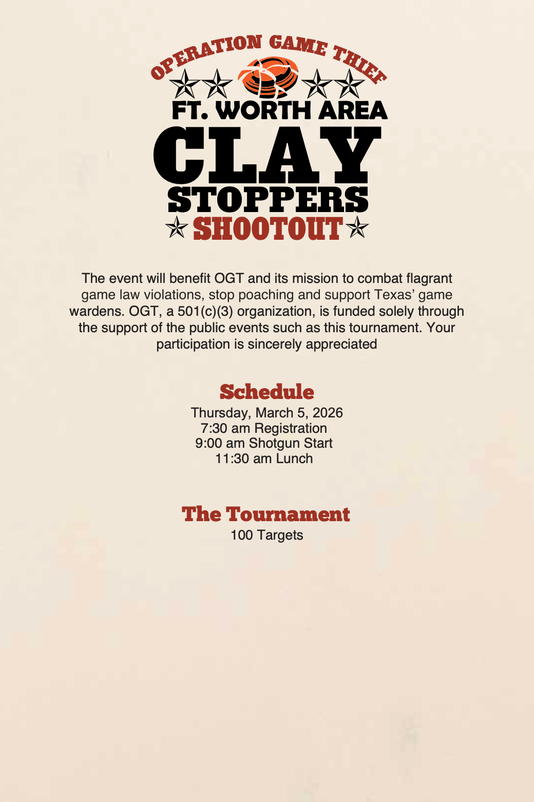 The Fort Worth Area Claystoppers event will benefit OGT and its mission to combat flagrant game law violations, stop poaching and support Texas’ game wardens. OGT, a 501(c)(3) corporation, is funded solely through the support of the public at events such as this tournament. Your participation is sincerely appreciated!