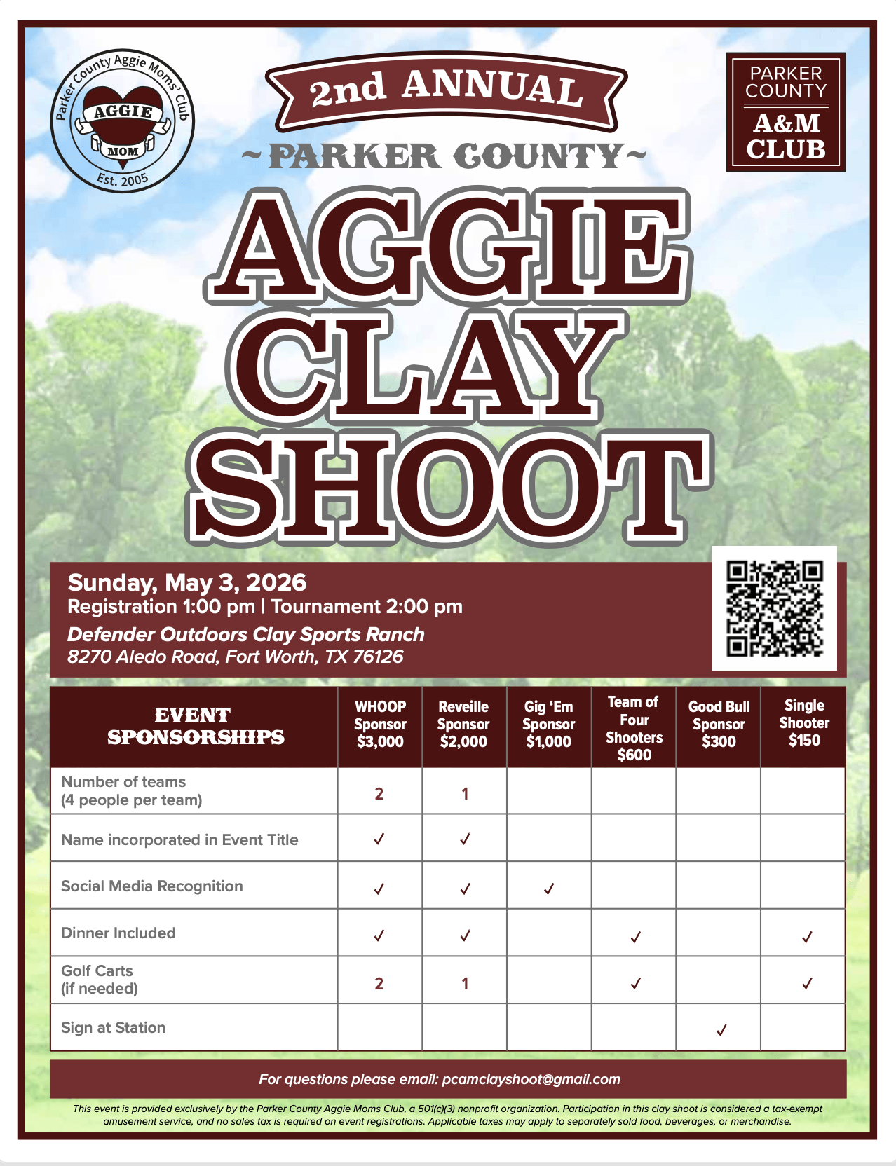 Join us on Sunday, May 3rd for the Parker County Aggie Clay Shoot at Defender Outdoors Clay Sports Ranch