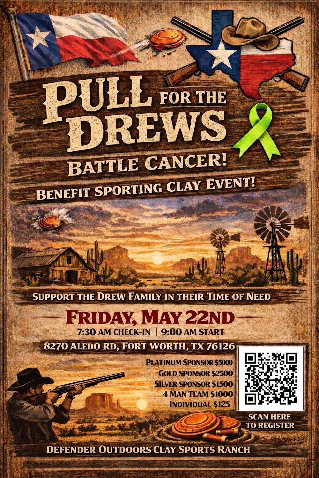 Join us for a day of community, camaraderie, and friendly competition as we come together to support the Drew family during their fight against cancer. This clay shoot benefit is more than a sporting event, it’s a chance to stand beside a family we care about and help lighten the load during an incredibly challenging time.