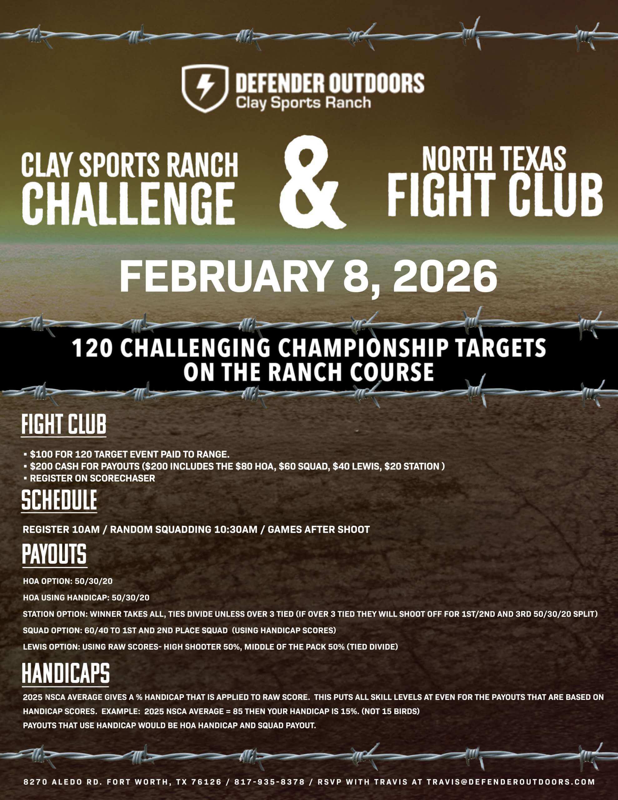 Defender Outdoors Clay Sports Ranch Out West Open Join us on Saturday, February 7th for our next NSCA Tournament! The Out West Open will feature SIX (6) different events! So […]